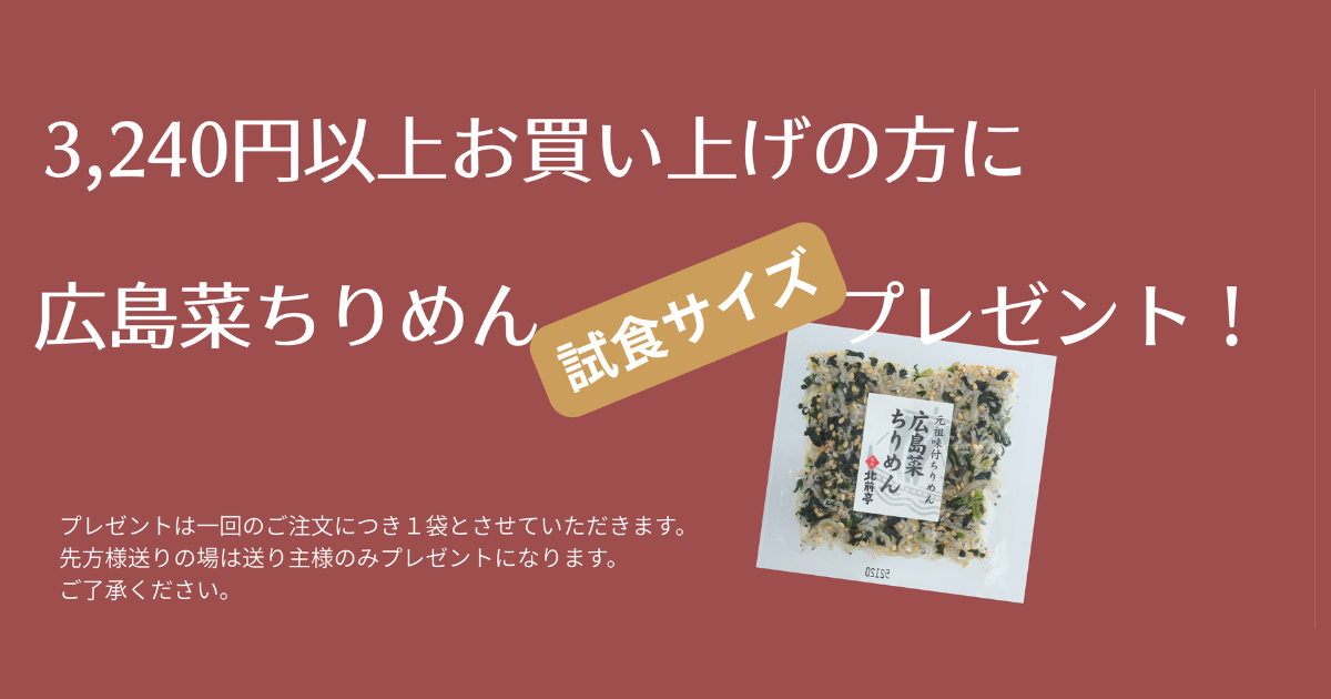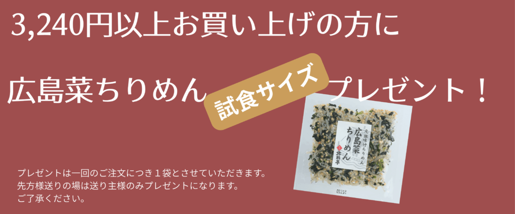 期間中、3,240円(税込み)以上お買い上げの方に、広島菜ちりめんをプレゼントいたします。