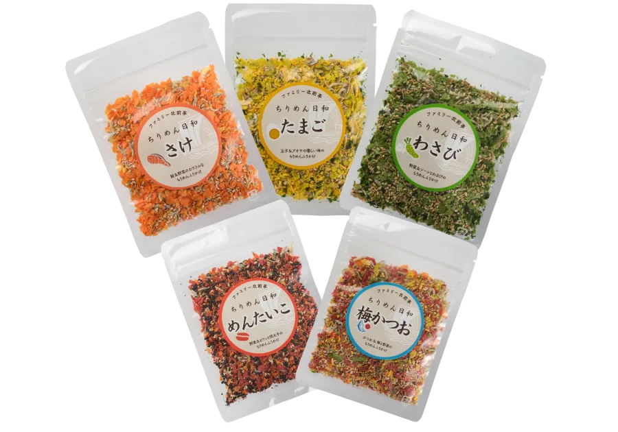 「ちりめん日和」は、彩りも栄養もばっちりな五色のふりかけシリーズ。